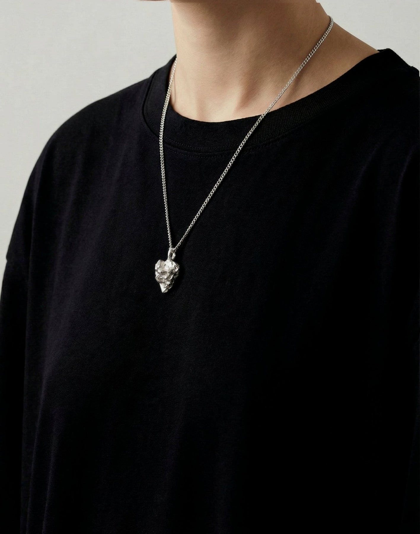 The Lithix pendant is a sculptural cluster form inspired by raw mineral fragments and fractured stone. Its compact, dimensional silhouette captures light across textured surfaces, creating subtle movement and depth.